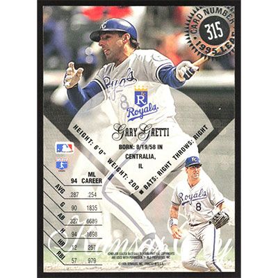 This is a 1995 Leaf Gary Gaetti baseball card. The card is #315 and pictures show condition.