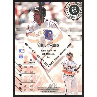 This is a 1995 Leaf Cecil Fielder baseball card. The card is #63 and pictures show condition.