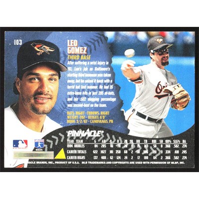 This is a 1995 Pinnacle Leo Gomez baseball card. The card is #103 and pictures show condition.