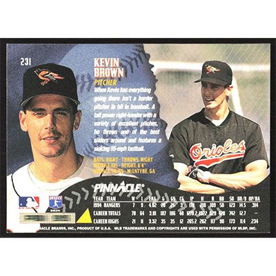 This is a 1995 Pinnacle Kevin Brown baseball card. The card is #231 and pictures show condition.