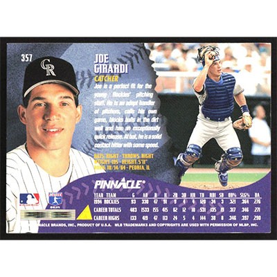 This is a 1995 Pinnacle Joe Girardi baseball card. The card is #357 and pictures show condition.