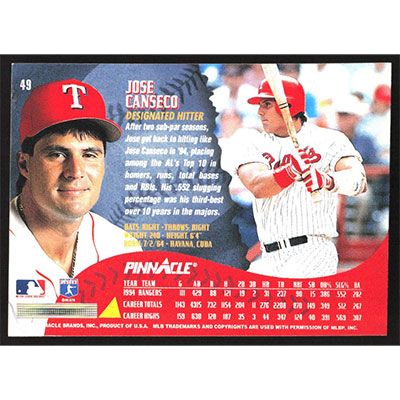 This is a 1995 Pinnacle Jose Canseco baseball card. The card is #49 and pictures show condition.