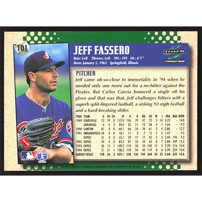 This is a 1995 Score Jeff Fassero baseball card. The card is #101 and pictures show condition.