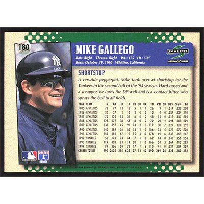 This is a 1995 Score Mike Gallego baseball card. The card is #180 and pictures show condition.