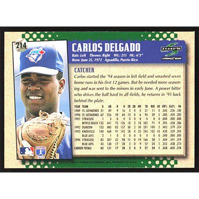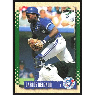 This is a 1995 Score Carlos Delgado baseball card. The card is #214 and pictures show condition.