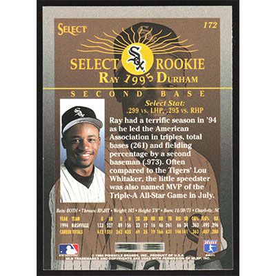 This is a 1995 Select Ray Durham baseball card. The card is #172 and pictures show condition.