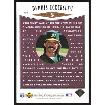 This is a 1995 SP Championship Dennis Eckersley baseball card. The card is #104 and pictures show condition.