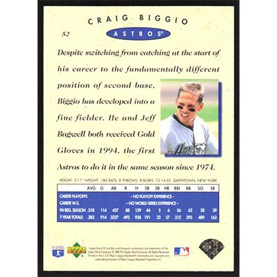 This is a 1995 SP Championship Craig Biggio baseball card. The card is #52 and pictures show condition.