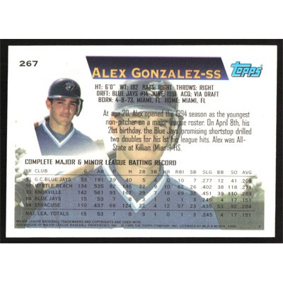 This is a 1995 Topps Alex Gonzalez Star Track baseball card. The card is #267 and pictures show condition.