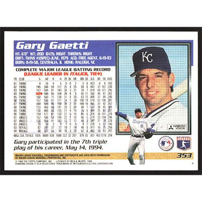 This is a 1995 Topps Gary Gaetti baseball card. The card is #353 and pictures show condition.
