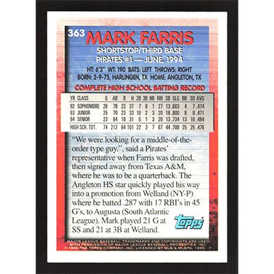 This is a 1995 Topps Mark Farris Draft Pick baseball card. The card is #363 and pictures show condition.