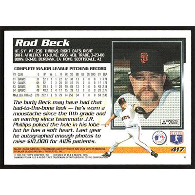 This is a 1995 Topps Rod Beck baseball card. The card is #417 and pictures show condition.