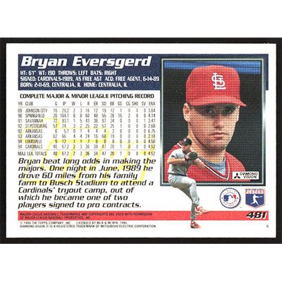 This is a 1995 Topps Bryan Eversgerd baseball card. The card is #481 and pictures show condition.