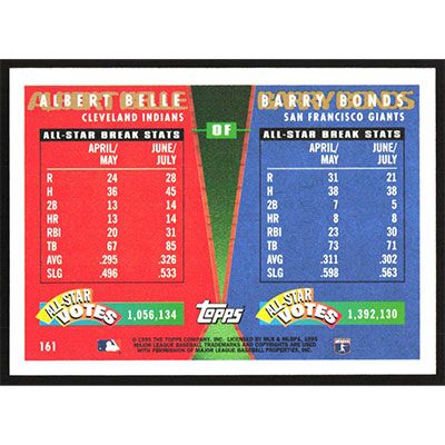 This is a 1995 Topps Traded Barry Bonds and Albert Belle Mid All-Stars baseball card. The card is #161 and pictures show condition. Team(s): San Francisco Giants/Cleveland Indians
