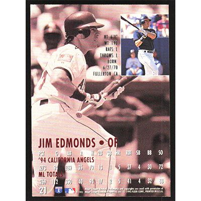 This is a 1995 Ultra Jim Edmonds baseball card. The card is #21 and pictures show condition.