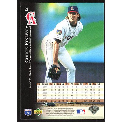 This is a 1995 Upper Deck Chuck Finley baseball card. The card is #21 and pictures show condition.