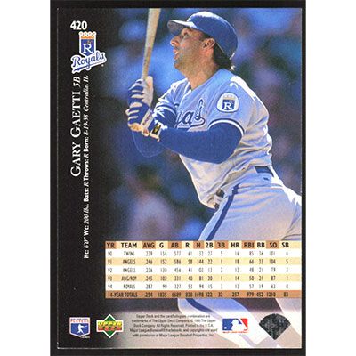 This is a 1995 Upper Deck Gary Gaetti baseball card. The card is #420 and pictures show condition.