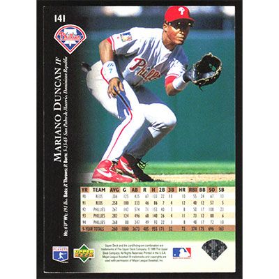 This is a 1995 Upper Deck Electric Diamond Mariano Duncan baseball card. The card is #141 and pictures show condition.