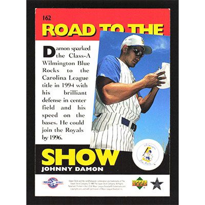 This is a 1995 Upper Deck Minors Johnny Damon Road to the Show baseball card. The card is #162 and pictures show condition. Team(s): Wilmington Blue Rocks