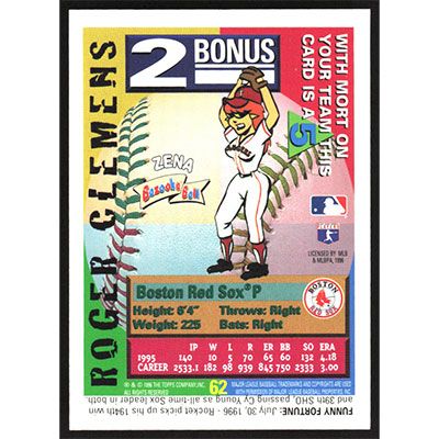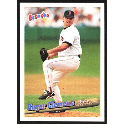 This is a 1996 Bazooka Roger Clemens baseball card. The card is #62 and pictures show condition.
