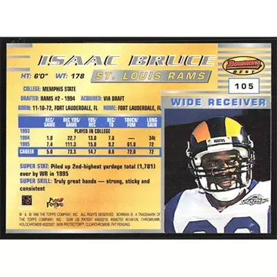 This is a 1996 Bowman's Best Isaac Bruce football card. The card is #105 and pictures show condition.