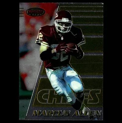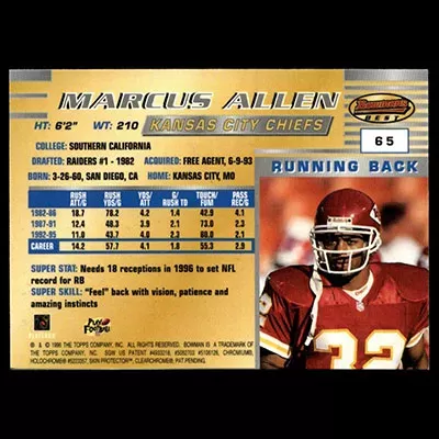 This is a 1996 Bowman's Best Marcus Allen football card. The card is #65 and is in NM-MT condition.
