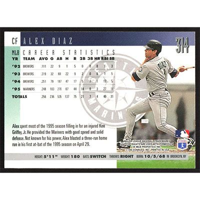 This is a 1996 Donruss Alex Diaz baseball card. The card is #314 and pictures show condition.