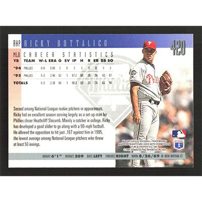This is a 1996 Donruss Ricky Bottalico baseball card. The card is #420 and pictures show condition.