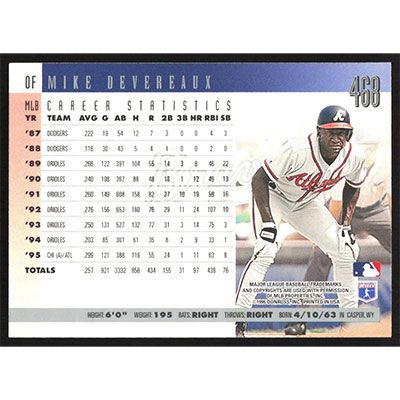 This is a 1996 Donruss Mike Devereaux baseball card. The card is #468 and pictures show condition.
