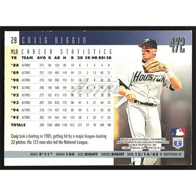 This is a 1996 Donruss Craig Biggio baseball card. The card is #472 and pictures show condition.