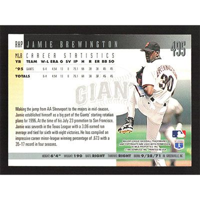 This is a 1996 Donruss Jamie Brewington baseball card. The card is #495 and pictures show condition.