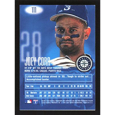 This is a 1996 E-Motion-XL Joey Cora baseball card. The card is #111 and pictures show condition.