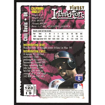 This is a 1996 Finest Chili Davis baseball card. The card is #123 and pictures show condition.