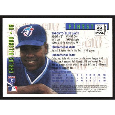 This is a 1996 Finest Carlos Delgado Phenoms baseball card. The card is #30 and pictures show condition.