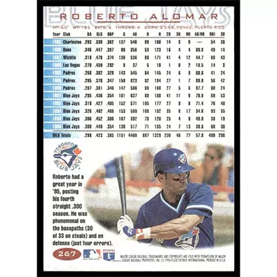 This is a 1996 Fleer Roberto Alomar baseball card. The card is #267 and pictures show condition.