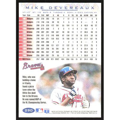 This is a 1996 Fleer Mike Devereaux autographed baseball card. This card has been signed, in blue, by Mike Devereaux, and is guaranteed authentic by Ballcardz.com. The card is #290 and pictures show condition.