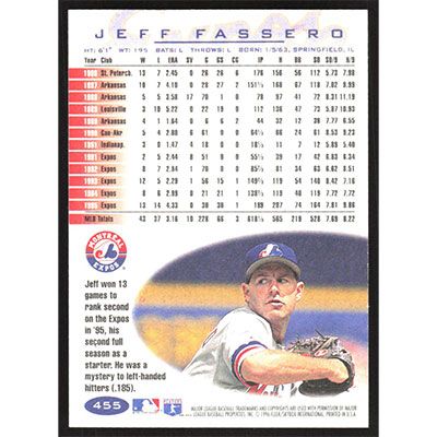 This is a 1996 Fleer Jeff Fassero baseball card. The card is #455 and pictures show condition.