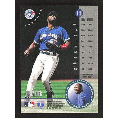 This is a 1996 Leaf Joe Carter baseball card. The card is #118 and pictures show condition.