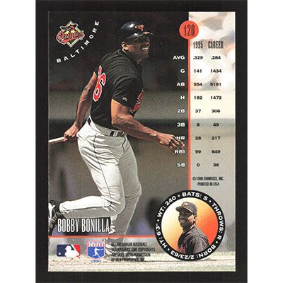This is a 1996 Leaf Bobby Bonilla baseball card. The card is #120 and pictures show condition.