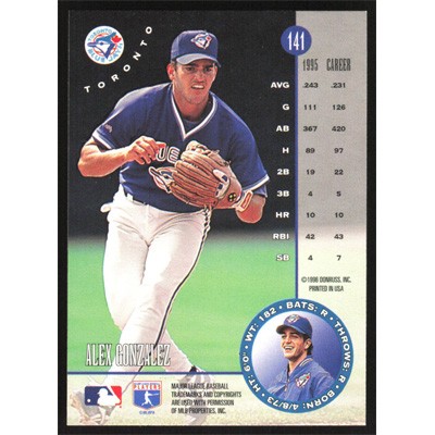 This is a 1996 Leaf Alex Gonzalez baseball card. The card is #141 and pictures show condition.