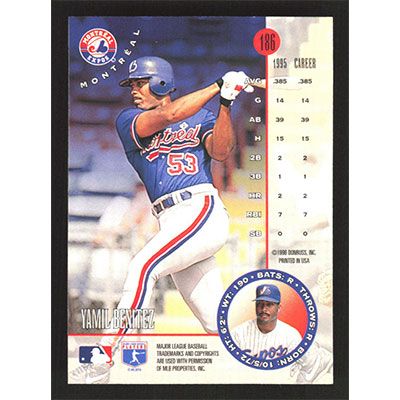 This is a 1996 Leaf Yamil Benitez baseball card. The card is #186 and pictures show condition.