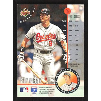 This is a 1996 Leaf Brady Anderson baseball card. The card is #36 and pictures show condition.