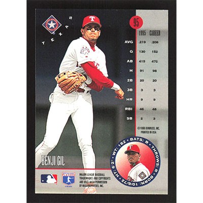 This is a 1996 Leaf Benji Gil baseball card. The card is #95 and pictures show condition.