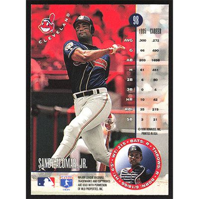 This is a 1996 Leaf Sandy Alomar Jr. baseball card. The card is #98 and pictures show condition.