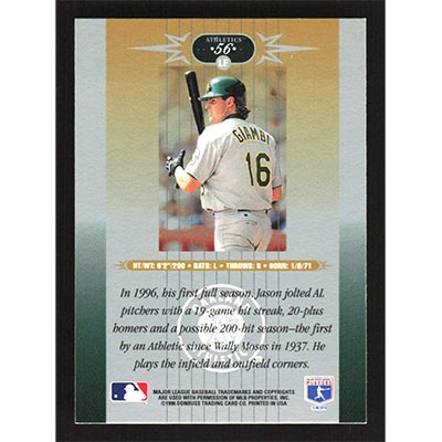 This is a 1996 Leaf Limited Jason Giambi baseball card. The card is #56 and pictures show condition.