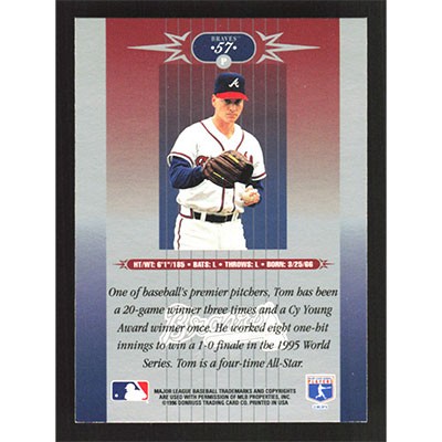 This is a 1996 Leaf Limited Tom Glavine baseball card. The card is #57 and pictures show condition.