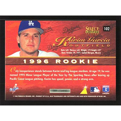 This is a 1996 Select Certified Karim Garcia baseball card. The card is #102 and pictures show condition.