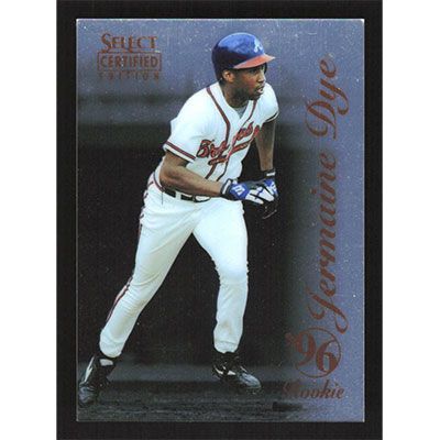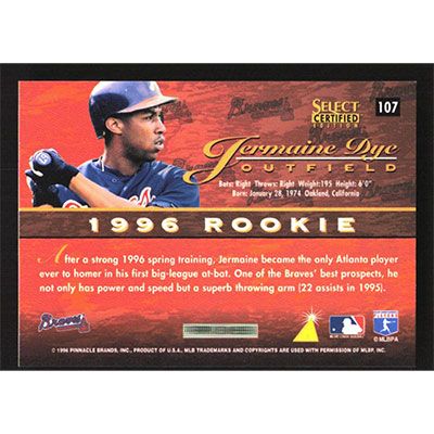This is a 1996 Select Certified Jermaine Dye baseball card. The card is #107 and pictures show condition.