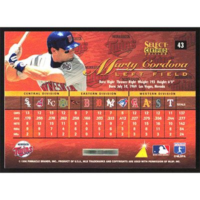 This is a 1996 Select Certified Marty Cordova baseball card. The card is #43 and pictures show condition.