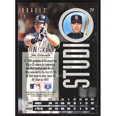 This is a 1996 Studio Jim Edmonds baseball card. The card is #75 and pictures show condition.